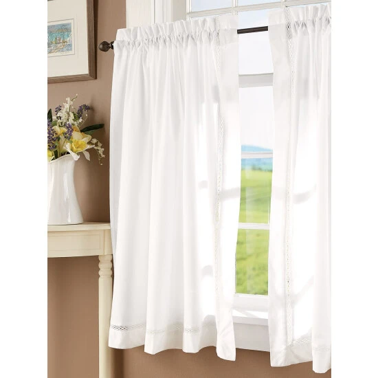 These pretty tiers are made of our smooth woven cotton and feature a unique crocheted lattice design that frames the curtains on three sides. Just that little detail adds timeless charm and appeal and dresses up your windows beautifully. Tiers are sold in pairs.