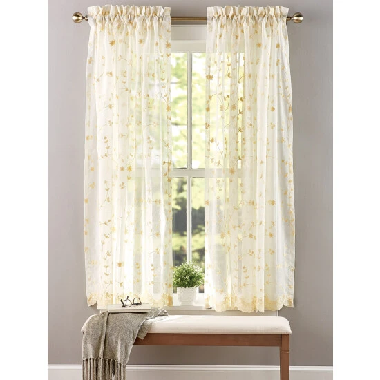 The allover floral embroidery adds charm and beautiful detailing to these curtain panels. The panels drape softly while allowing light to beautifully filter through the finely woven fabric. Use alone or dress up with the matching valance, swag, or balloon panel. Panels are sold individually.