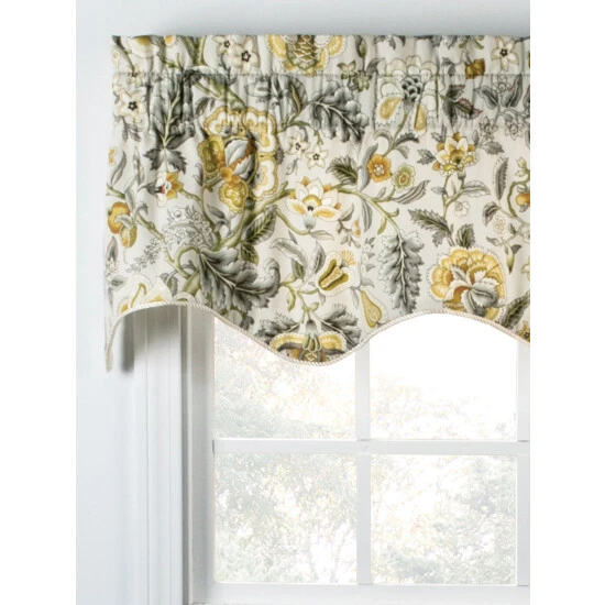 This richly patterned valance features a floral print that’s reminiscent of the tapestries you’d find in English manor homes. Finished with corded trim on the scalloped hem. Lined valance is sold individually.