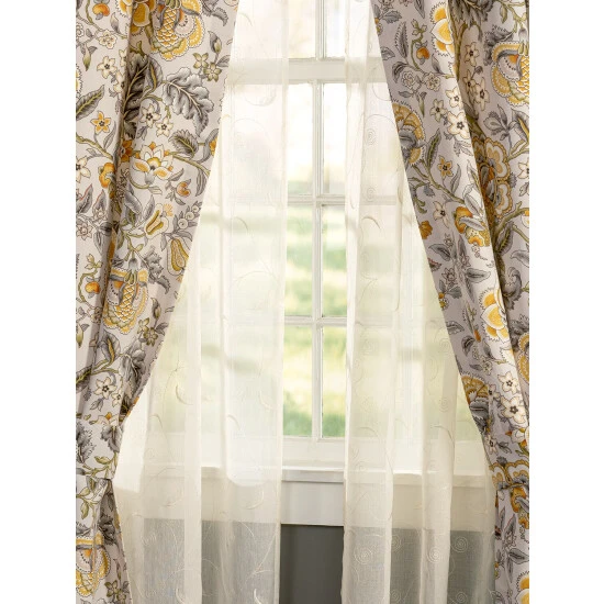 This gauze-like sheer panel lets the light filter in for maximum effect. Each panel is adorned with delicate, swirling vine embroidery and has a voluminous, airy drape and delicately scalloped hem. Panel is sold individually.