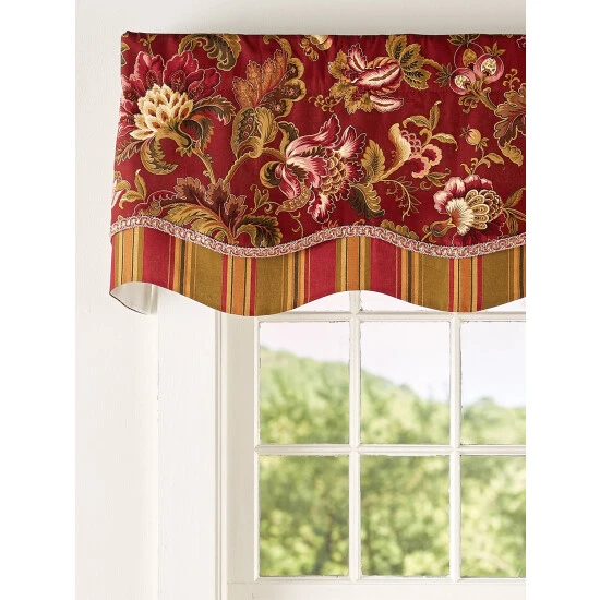 Bold Jacobean florals blossom with elegance across this richly colored scalloped valance. It’s layered with stripes and accented with braided trim for added style and beauty, and it’s lined, so it drapes gracefully. Valance is sold individually.