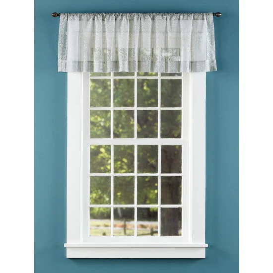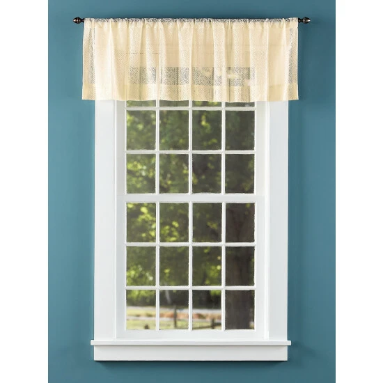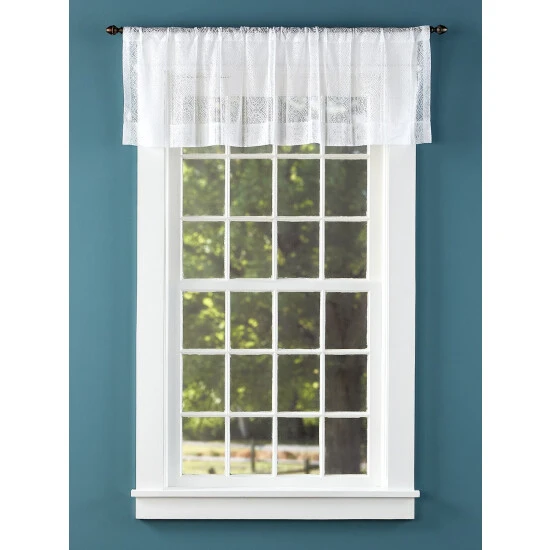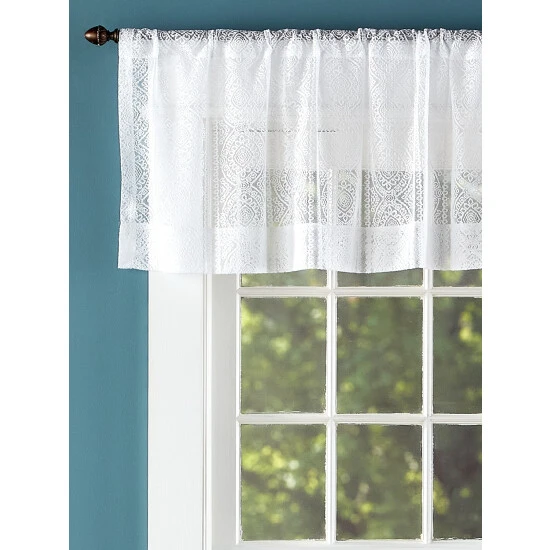 This semi-sheer valance features an all-over lace design woven with a classic medallion motif. The soft lace fabric drapes beautifully to frame your windows with the romantic look of light and airy lace. Valance is sold individually.