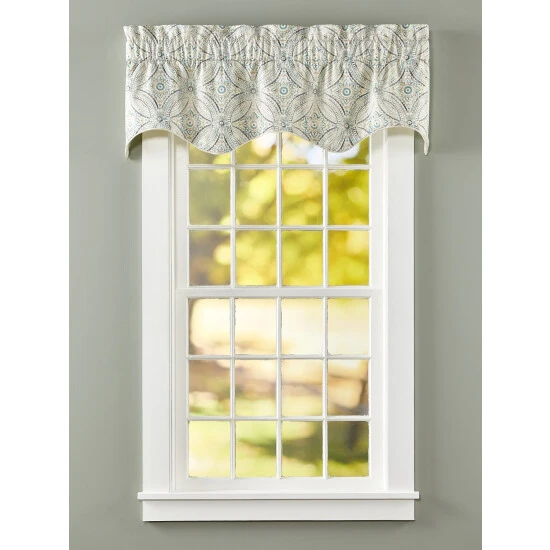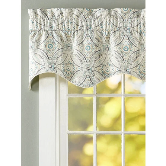 Inspired by handcrafted Moroccan tiles and washed in colors of the ocean and sky, this beautifully scalloped valance freshens up any room in your home. The valance is finished with a braided cord hem. Valance is sold individually.