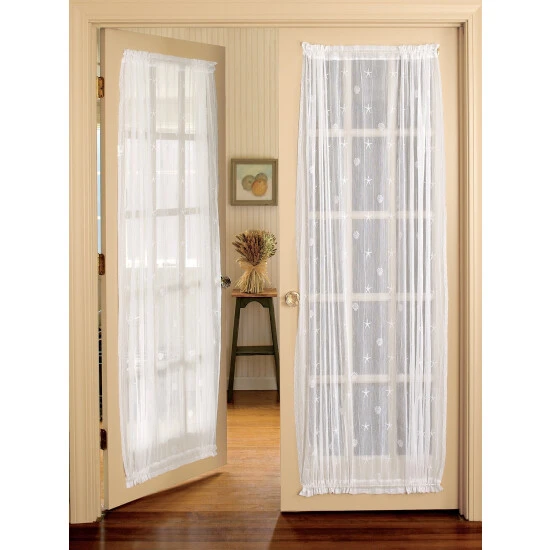 Ideal for French doors and doors with center glass panels, these gauzy lace panelslet in diffused light while offering a level of privacy where you need it most. The airy panel features an all-over pattern of starfish and scallop shells for a laid-back beachside look. The panel has rod pockets on both ends and is sold individually.