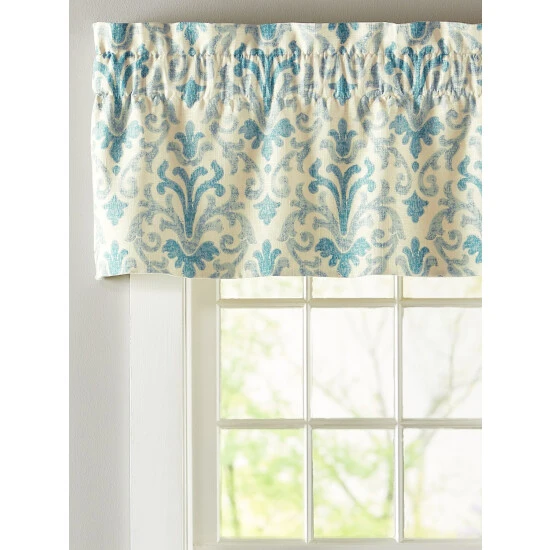 Fancied with a scrolling damask print, this linen-blend tailored valance has a regal look that will enhance any room in your home. Finished with a straight hem. Lined valance is sold individually.